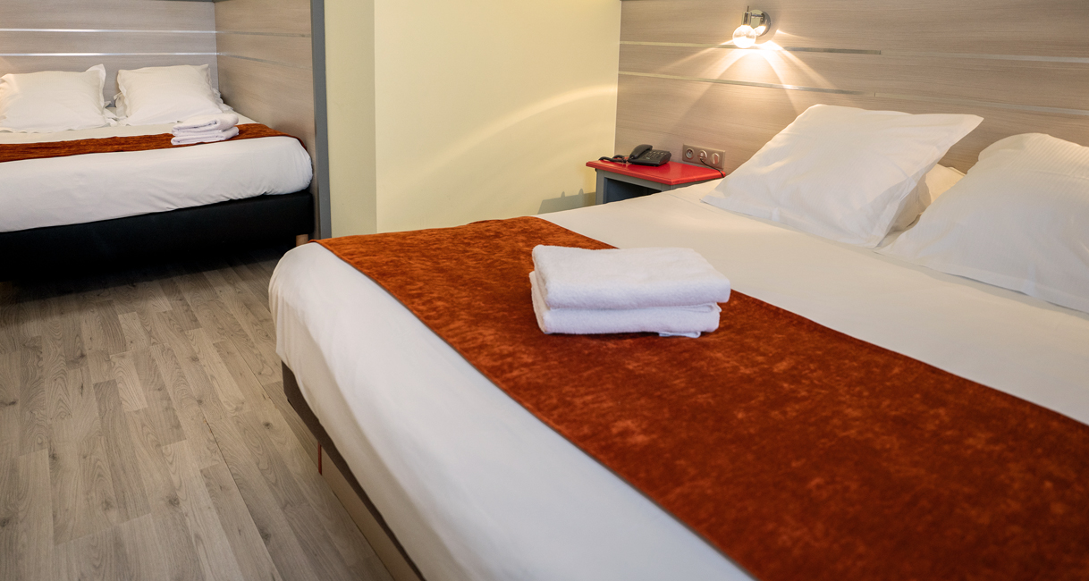 Exemple de chambre Quadruple Standard tout confort équipée de 1 lit double 160 cm et de 1 lit double 140 cm.