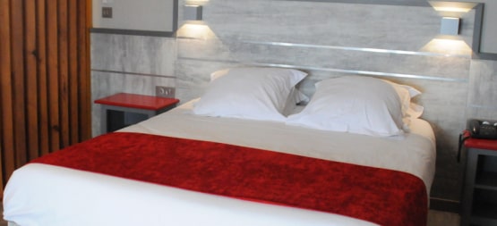 Exemple de chambre « Soirée Étape » en lit double avec salle de bain (baignoire ou douche selon disponibilité) comprenant le repas du soir et le petit déjeuner. ATTENTION ce type d’offre est dédiée uniquement aux entreprises, merci de nous contacter.