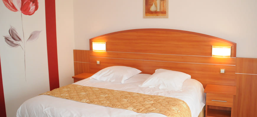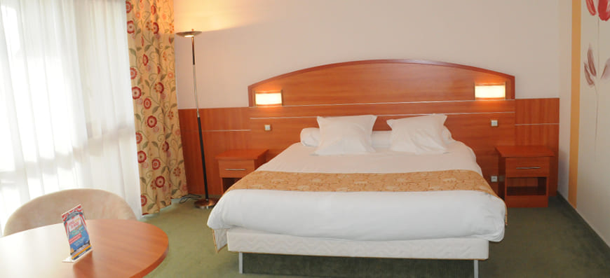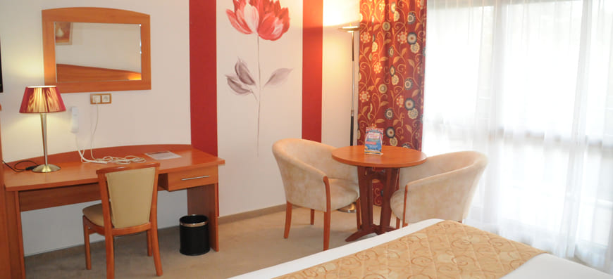 Modèle de chambre pour 1 personne avec lit double. Toutes nos chambres ont un standing équivalent ; spacieuses et bien équipées, une décoration moderne dans des tons chaleureux et un balcon privatif pour admirer le charme de la nature alsacienne.