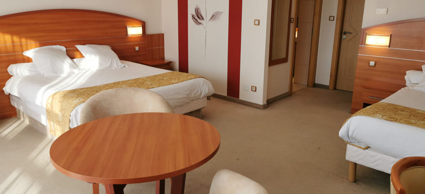Modèle de chambre pour 3 personnes avec un lit double de 180cm et un lit de 140cm. Toutes nos chambres ont un standing équivalent ; spacieuses et bien équipées, une décoration moderne dans des tons chaleureux et un balcon privatif pour admirer le charme de la nature alsacienne.